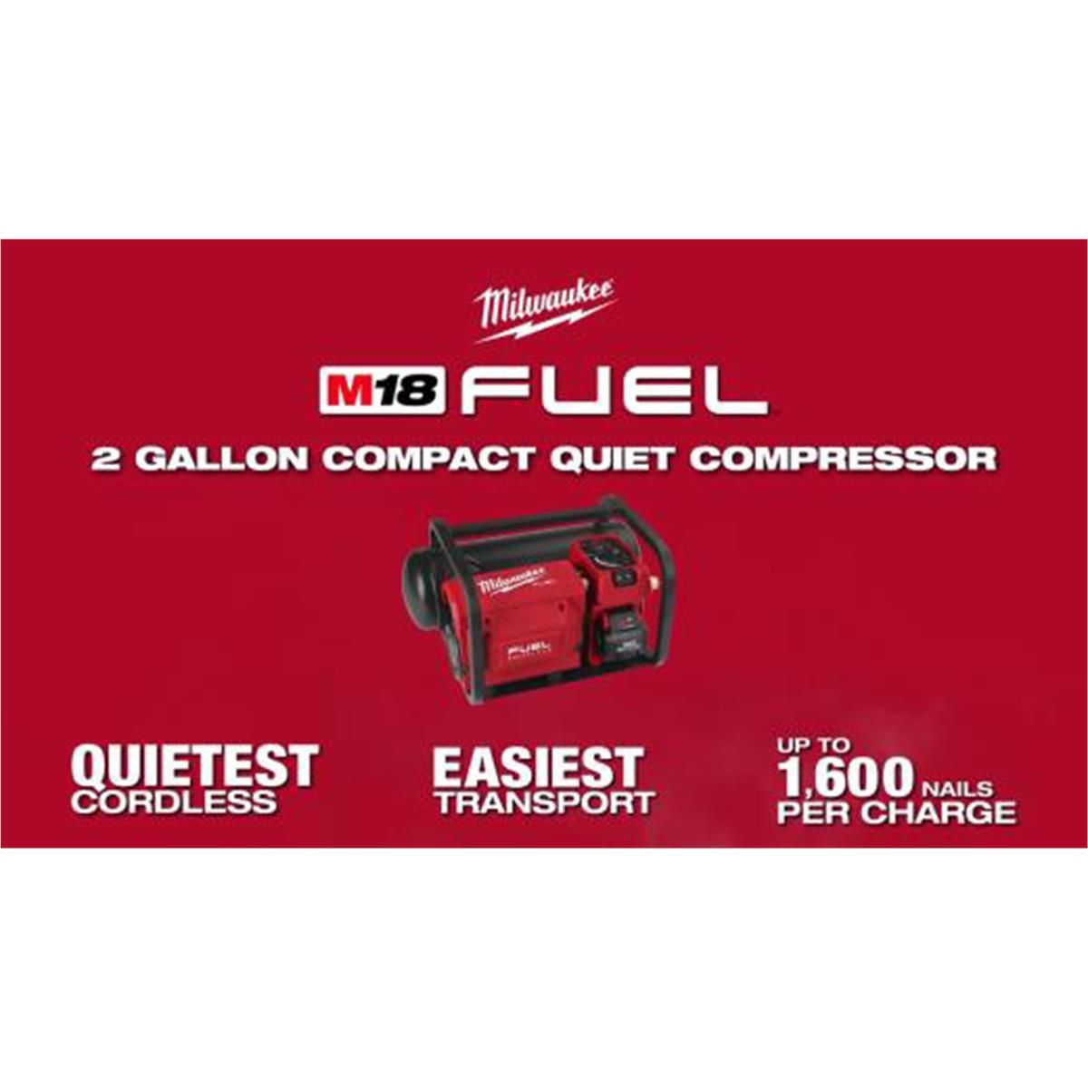 The M18 FUEL™ 2 Gallon Compact Quiet Compressor is designed for the professional carpenter and remodeler. This quiet air compressor is only 68dB(A), making it the quietest cordless compressor on the market and quieter than most corded options. We�ve designed this 2-gallon air compressor to be high performing while reducing the noise professionals deal with on jobsites. Its low profile and stackable design allow our portable air compressor to be easily stored and transported on, around, and back off the jobsite. It has run-time professionals need to stay productive, giving you up to 1,600 18ga brad nails per charge. It is compatible with all MILWAUKEE® M18™ REDLITHIUM™ batteries making it easy to swap packs and keep running to finish your job.