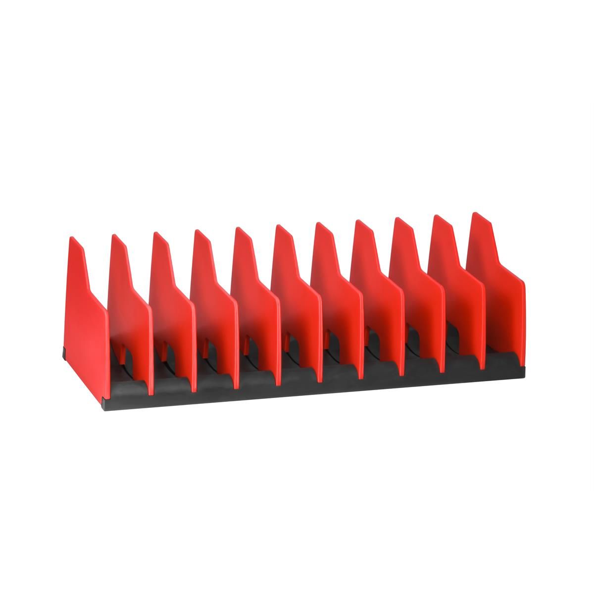 Designed with a premium rubber base which grips tools and the toolbox drawer to keep it all in place. Accommodates a wide variety of tools, holding a total of 10. Break-away hang tab lets multiple racks sit side by side.