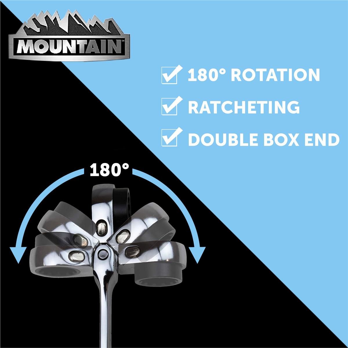 • Mountain 5-Piece Metric Double Box Universal Spline Reversible Ratcheting Wrench Set; 8 mm - 19mm, 90 Tooth Design, Long, Flexible, Reversible; MTNRM6
