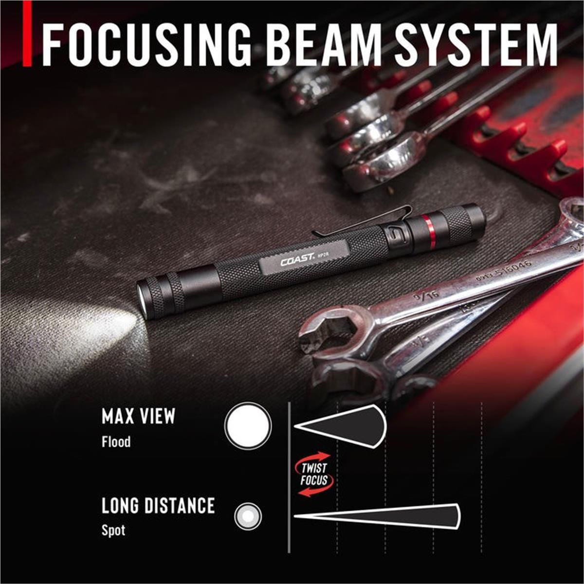 - Twist Focus: Dial in the shape of light you need for the situation. COASTs TWIST FOCUS™ system makes it easy to move between spot and flood beams by simply rotating the head of the flashlight.